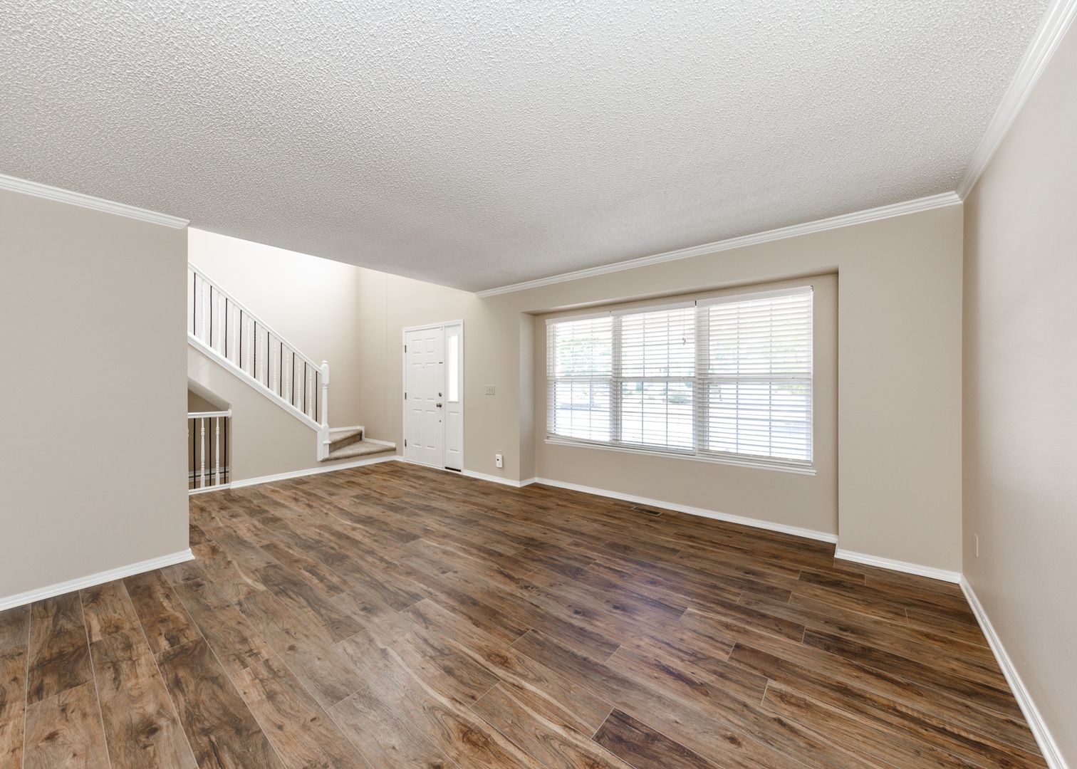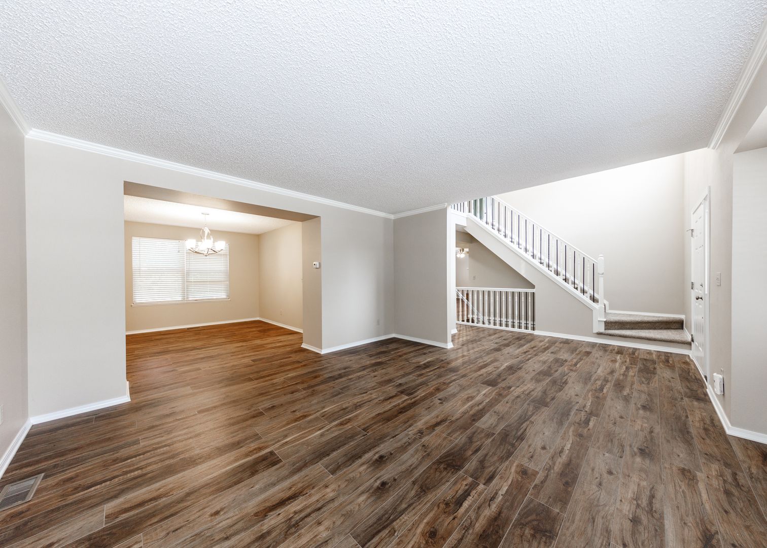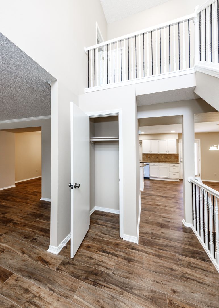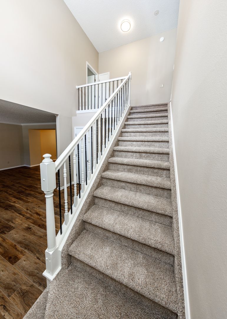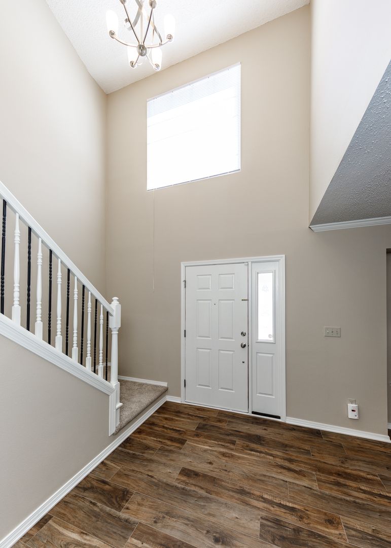 Step inside to a welcoming entryway featuring soaring two-story ceilings, brand new luxury vinyl plank (LVP) flooring, and a grand staircase with fresh carpet. To your left, a formal living room with crown molding and a coat closet offers the perfect space for entertaining, while straight ahead you'll find the heart of the home.
