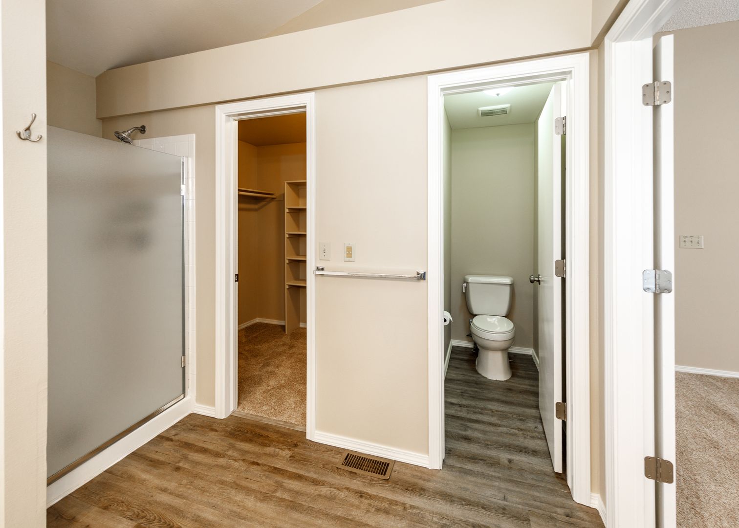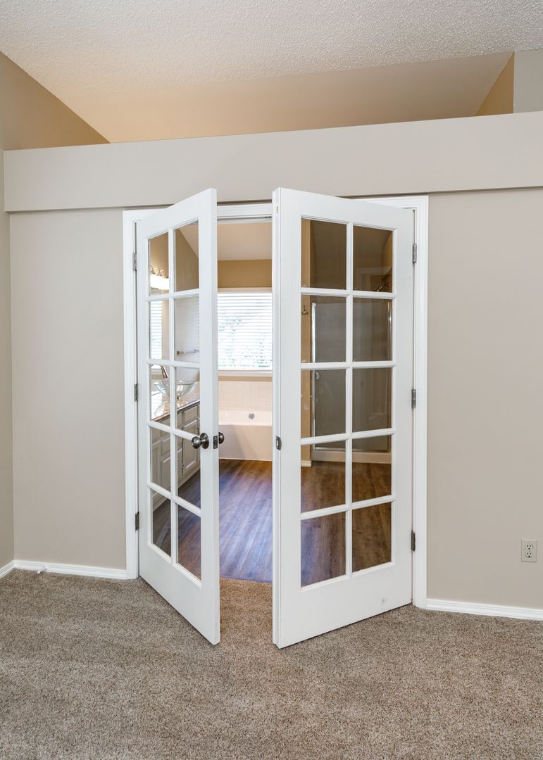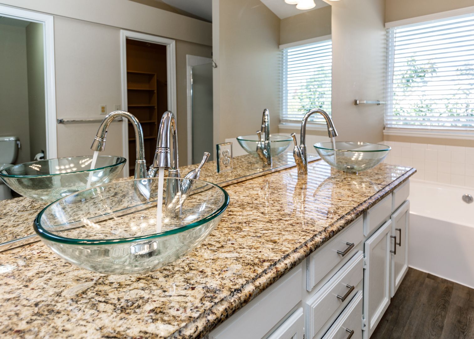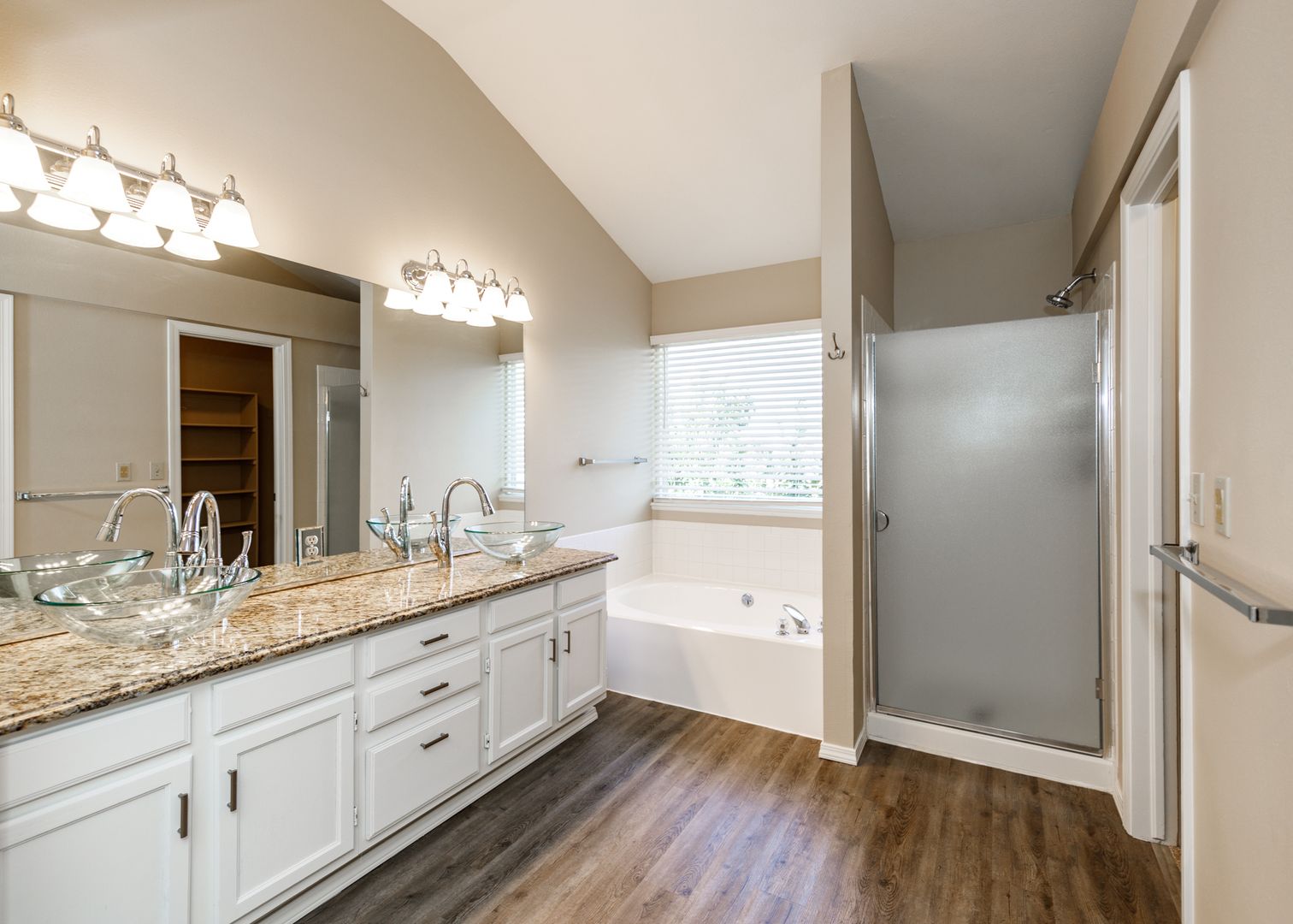 Upstairs, a thoughtful split floor plan provides privacy and space for everyone. The luxurious primary suite spans the entire left wing of the home and features French doors, new blinds, ceiling fan, and a spa-like ensuite bath with a granite double vanity, garden tub, walk-in shower, private toilet room, and walk-in closet.