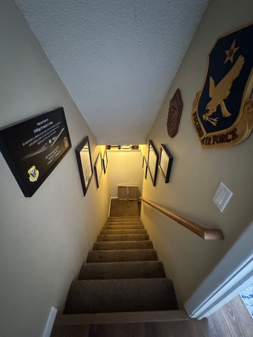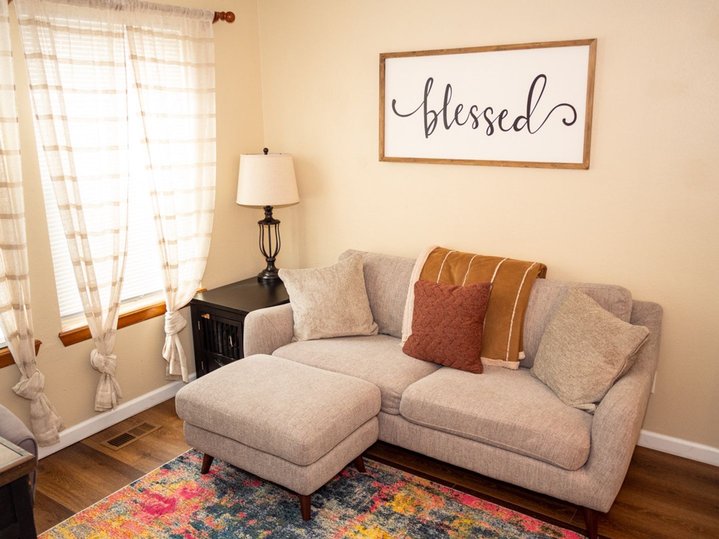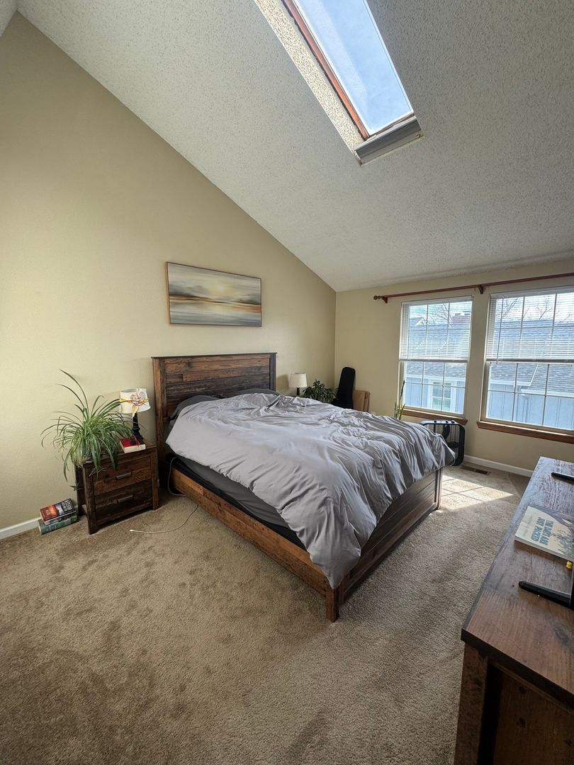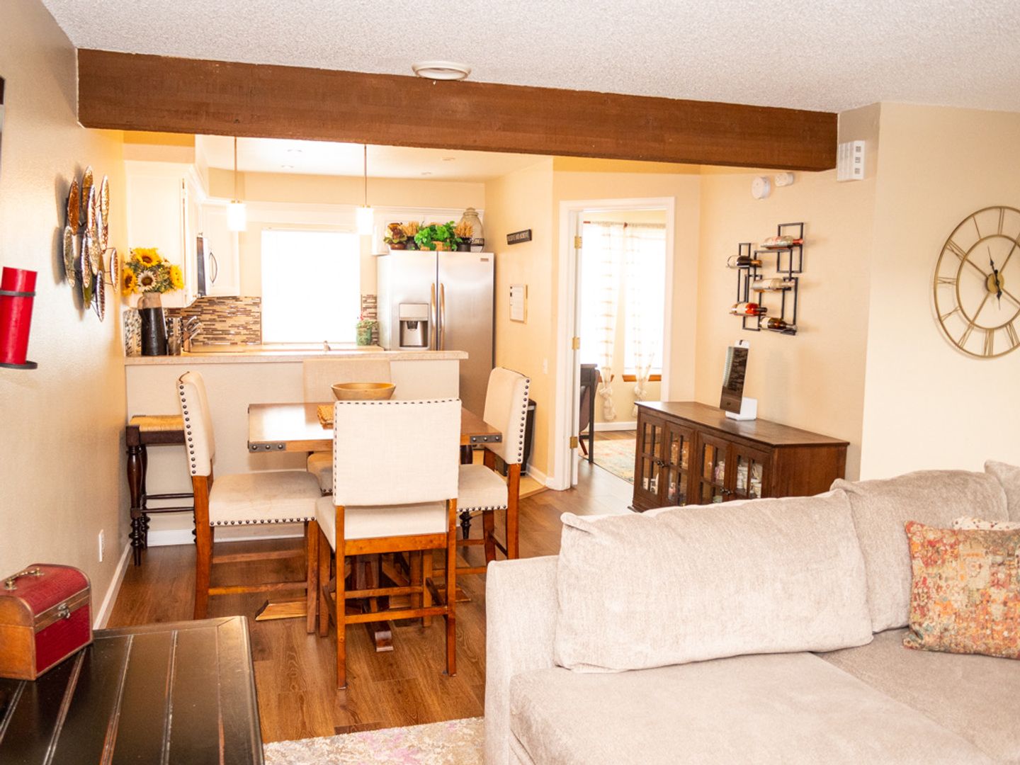 This two story townhome has laminate flooring on the main level with a family room, fireplace, open kitchen with stainless appliances and one bedroom and bathroom. Upstairs has two more bedrooms with a full bath to share and a wide landing that could be used like a sitting area.