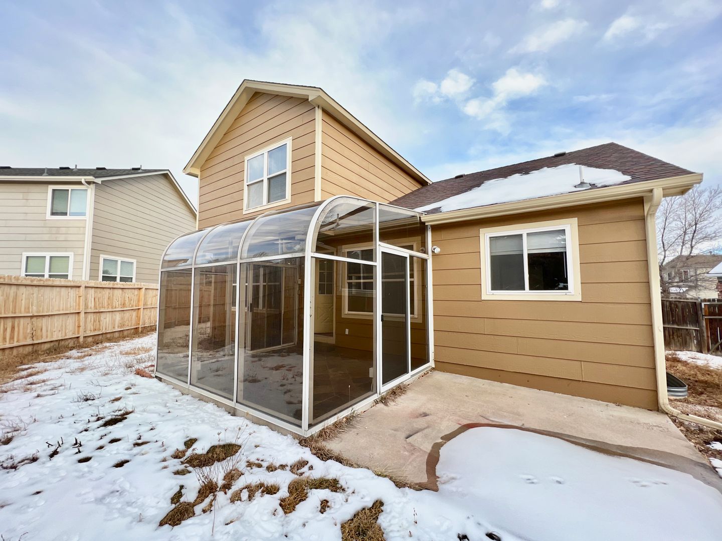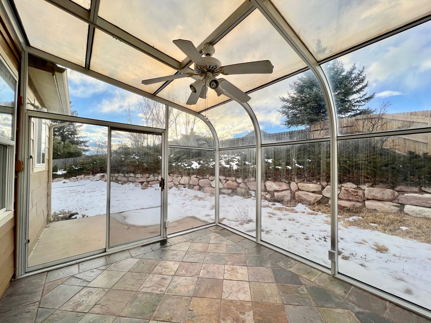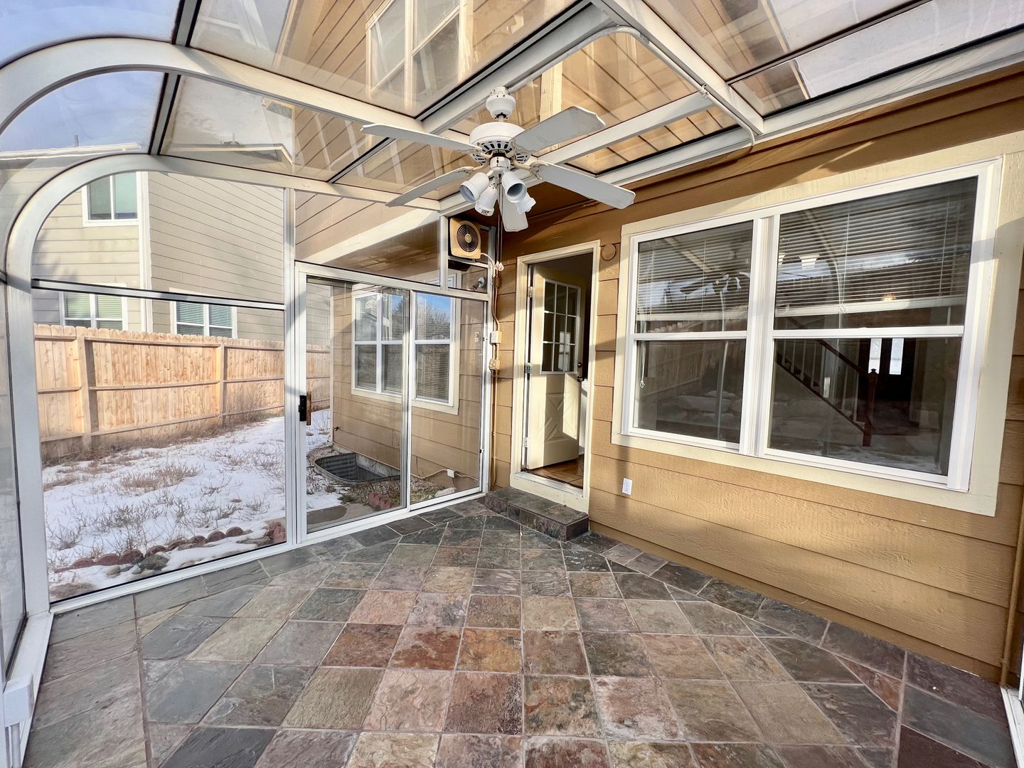 Walk out to a beautiful attached winter garden and large fenced yard with storage shed