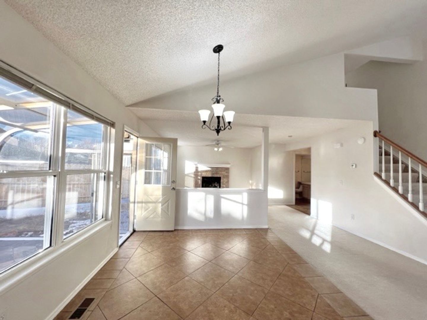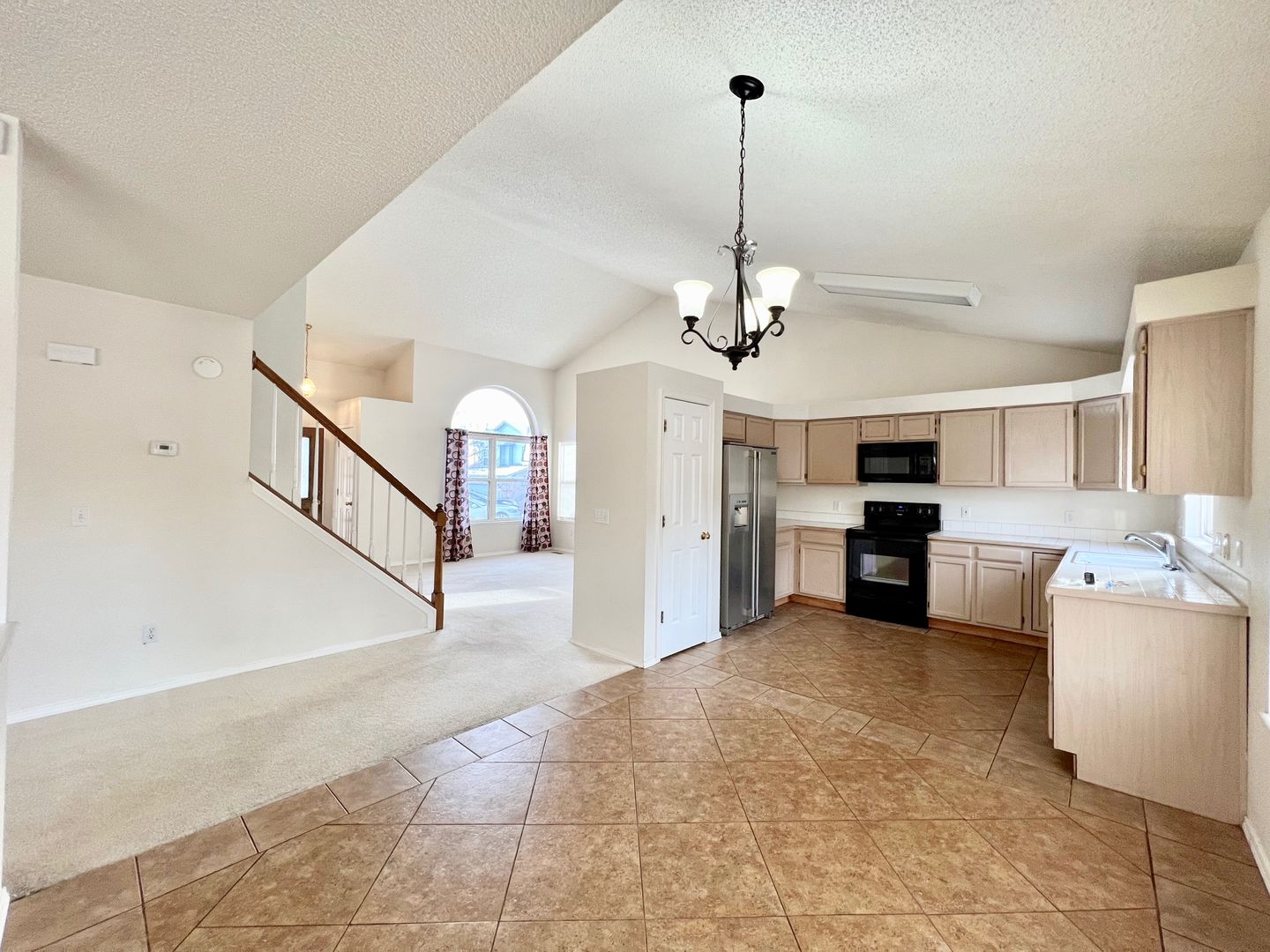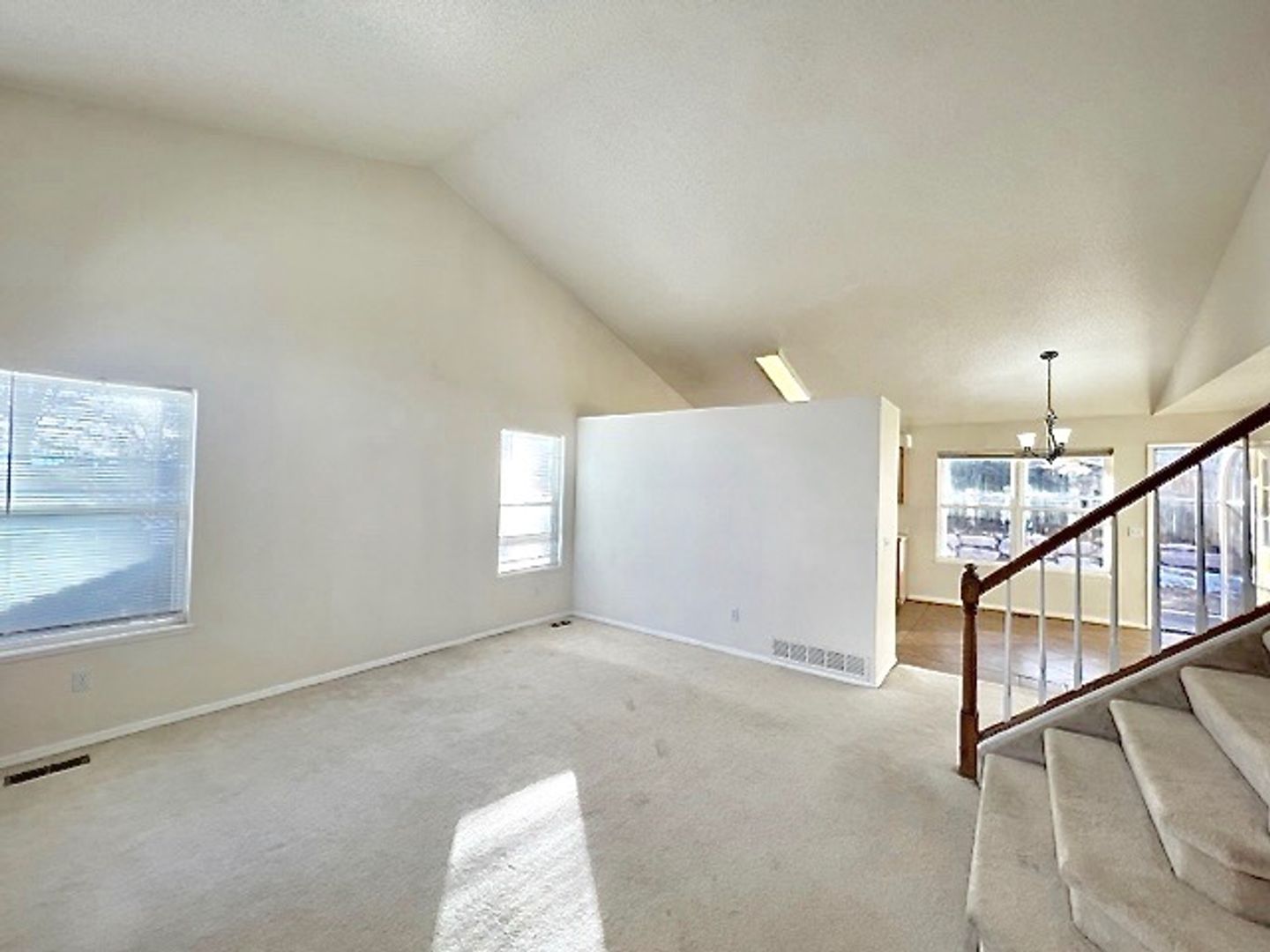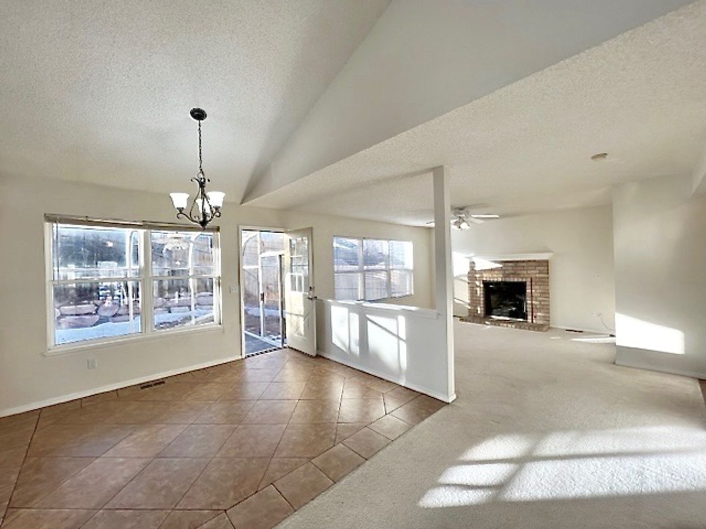 Open layout main level with vaulted ceiling, formal living room, spacious kitchen with dining area and a family room with wood burning fireplace.