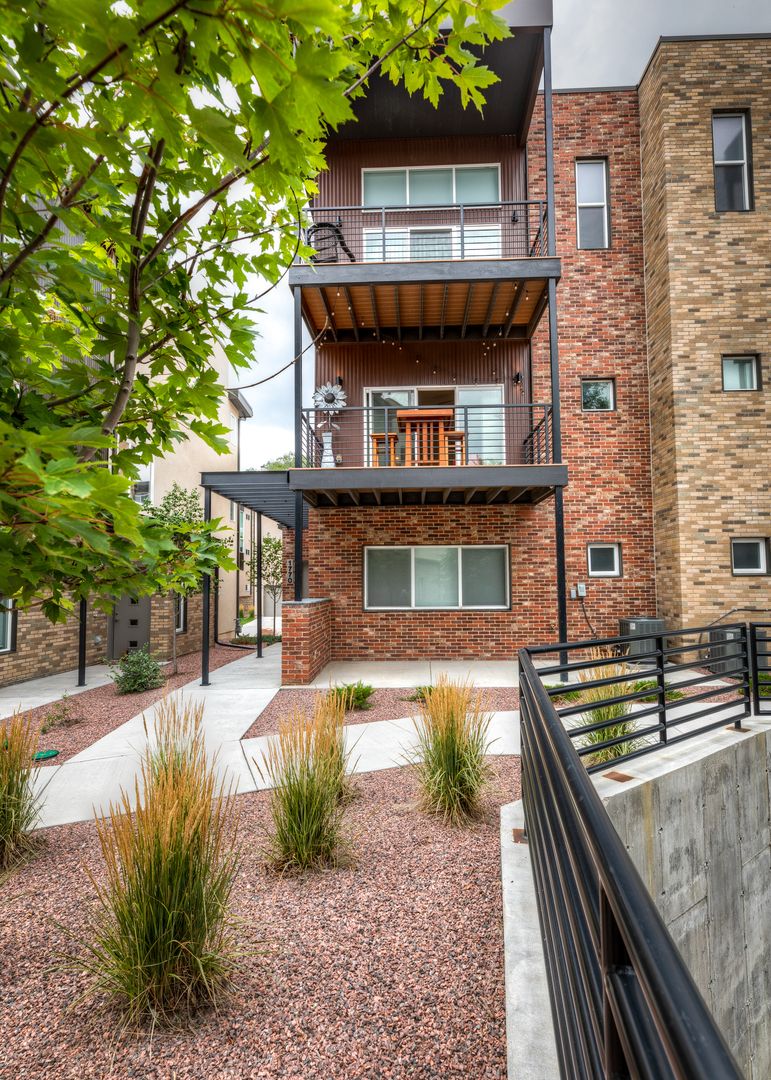 Urbanite Living at it's FINEST! Luxury, maintenance free townhome in the historic Ivywild neighborhood. Detailed interior designs with 9' ceilings, Heat N GLO 58" electric fireplace, Smart Sterling maple cabinets with crown molding, quartz countertop with 6" tile backsplash, stainless steel appliances, gas range. Luxurious baths with quartz countertops and tile backsplashes, ceramic tile shower w decorative accents, pedestal sink in powder room. Energy efficient features include a Rheem tankless water heater, LED lights thru out and A/C. This unit has finished guest suite and bath on ground floor!! The main level has a beautiful kitchen with large island, lots of cabinets and counterspace, dining room and living room with electric fireplace and walkout to deck. The top floor has 2 big suites with balconies and ensuite luxury bathrooms and walk-in closets. Home is equipped with private elevator. Walking, biking trails to restaurants, retail, groceries and the Sante Fe trail. Close to downtown nightlife and 5 minutes to hwy I- 25. The Ivywild area is going under a complete revitalization with retail, restaurants, boutique hotel all along the renovated creek.