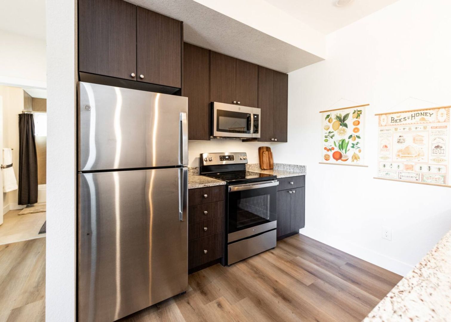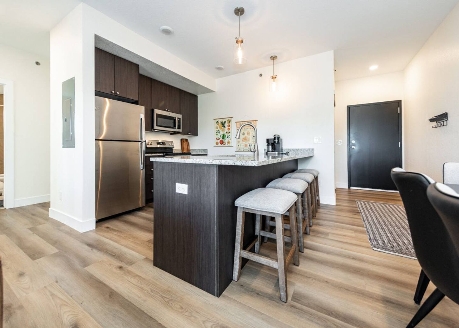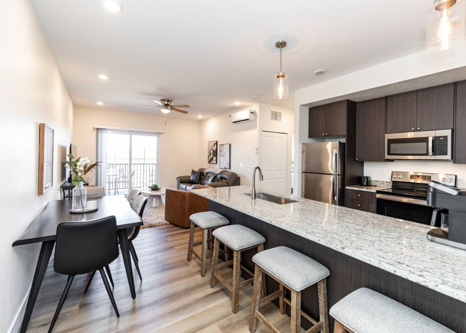 Stylish Interiors: Stainless steel appliances, granite countertops, 42″ soft‑close cabinetry, and a spacious island that seats 4.