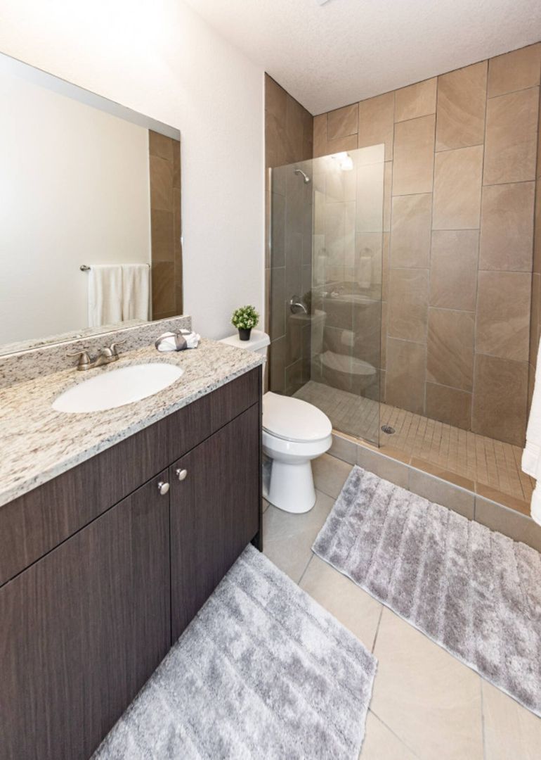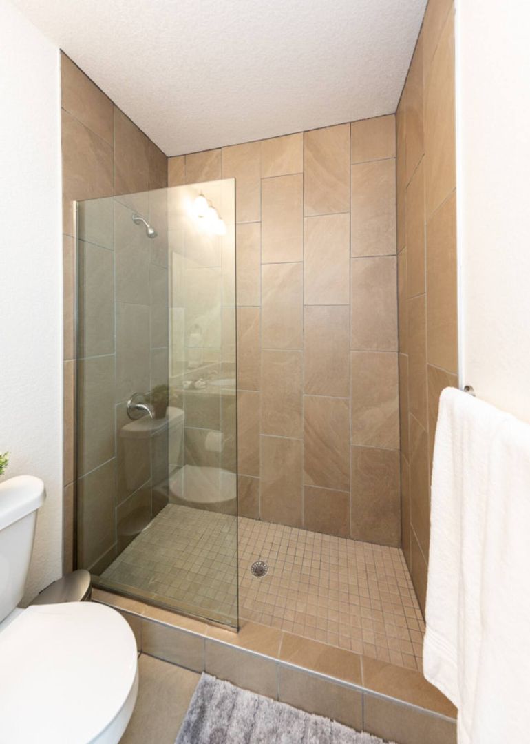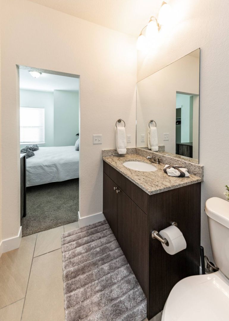 Primary Suite: King and smart TV, with a deep closet and an ensuite bathroom featuring a granite-top vanity and spa-style walk-in shower.