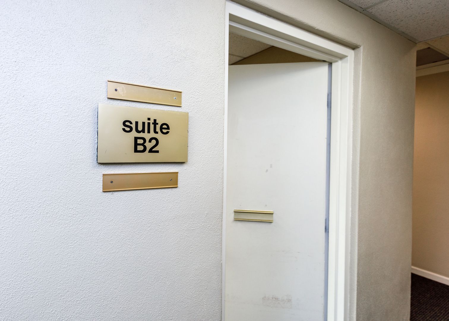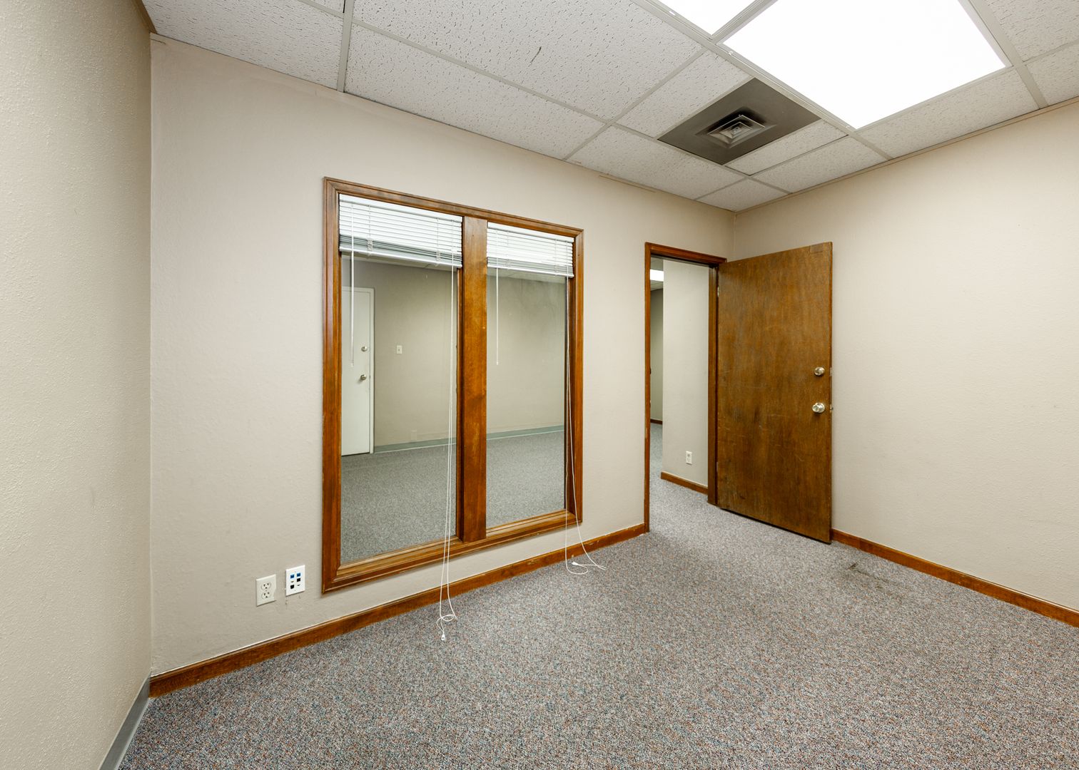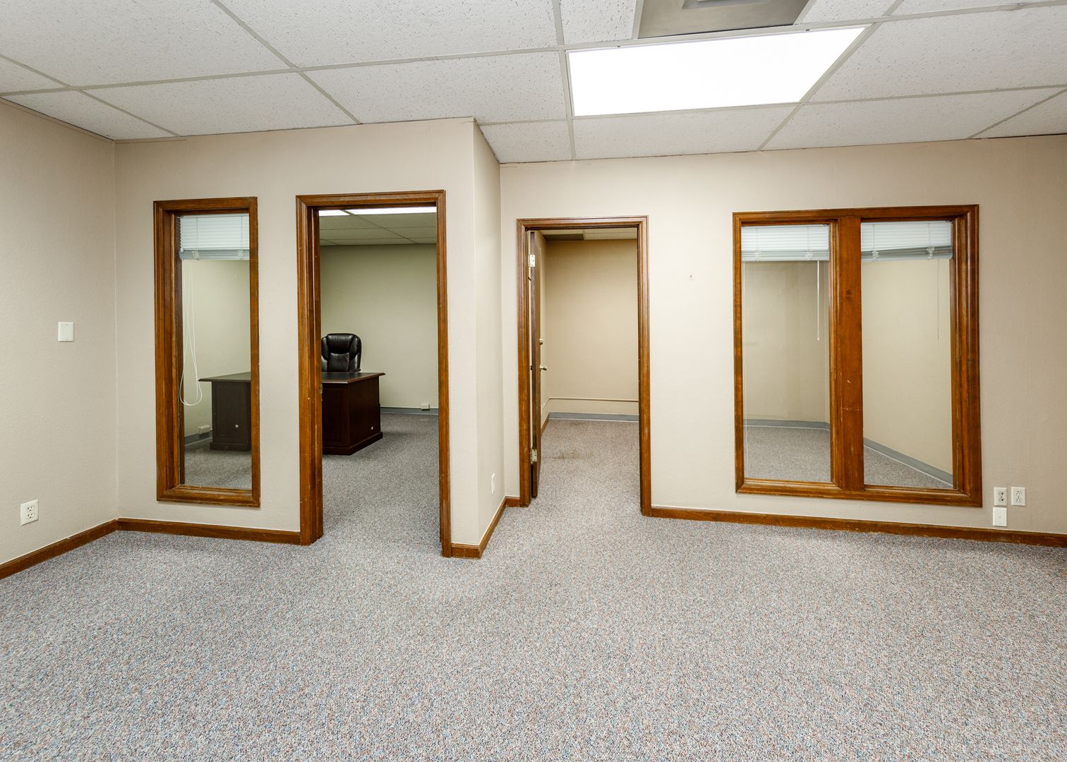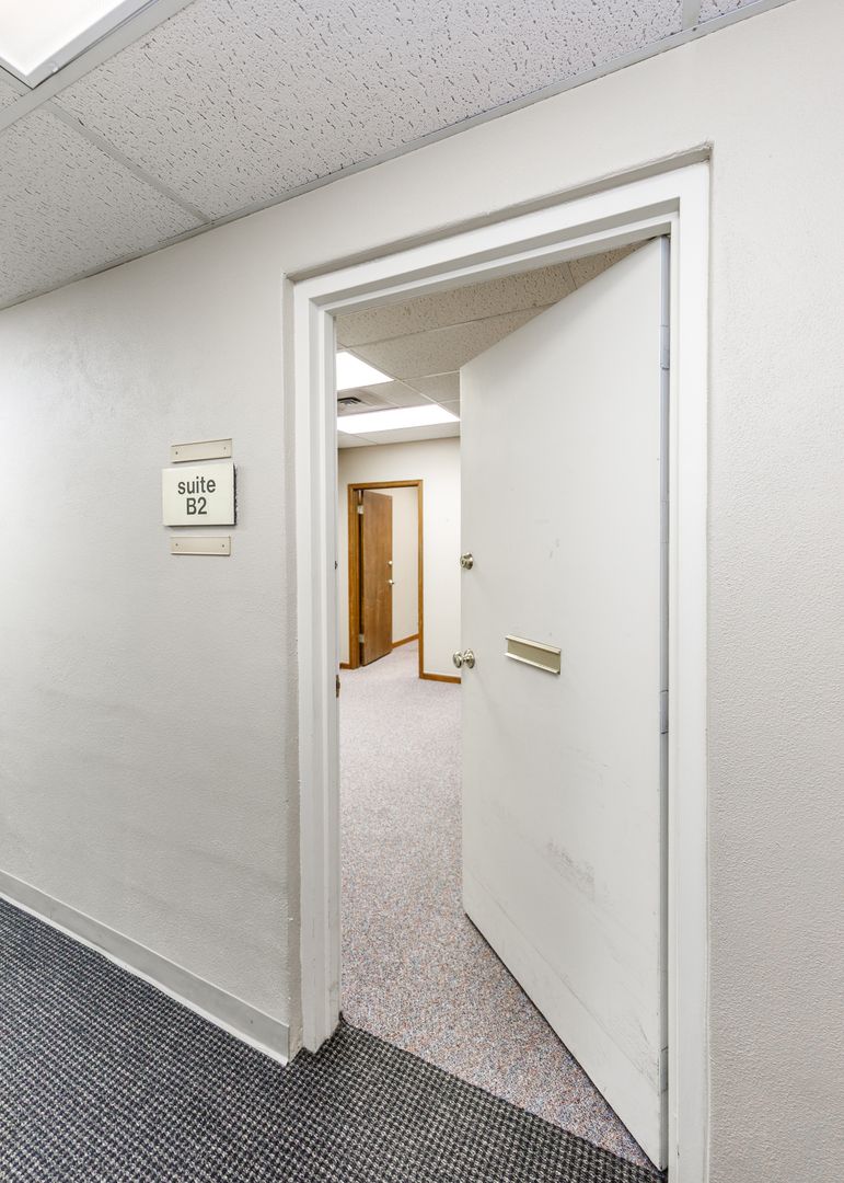 Suite B2 offers a spacious and functional layout with three rooms totaling approximately 460 square feet. The suite includes a large main room measuring 20’ x 11’, with two private offices branching off the main space. These offices feature large windows with blinds for privacy and measure 9’ x 12’ and 11’ x 12’.